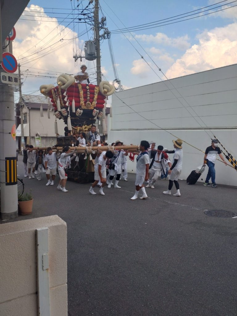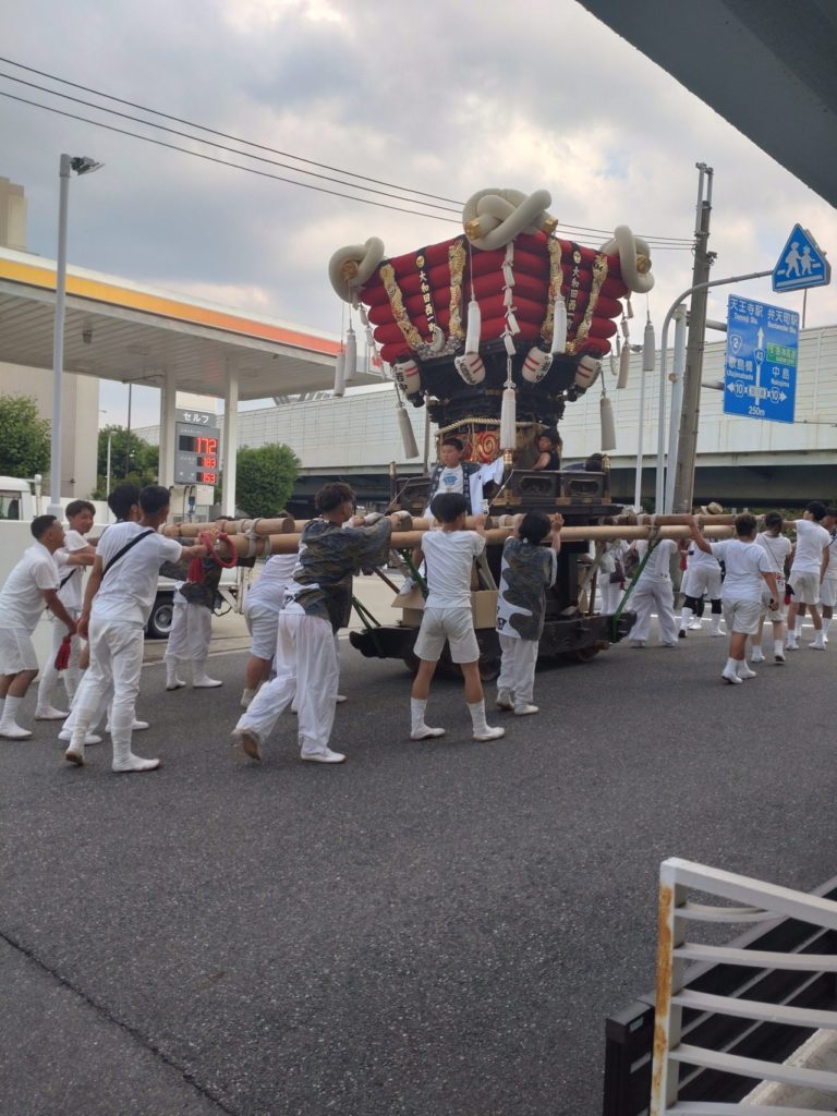 太鼓の音を響かせながら山車を担いで練り歩く、
