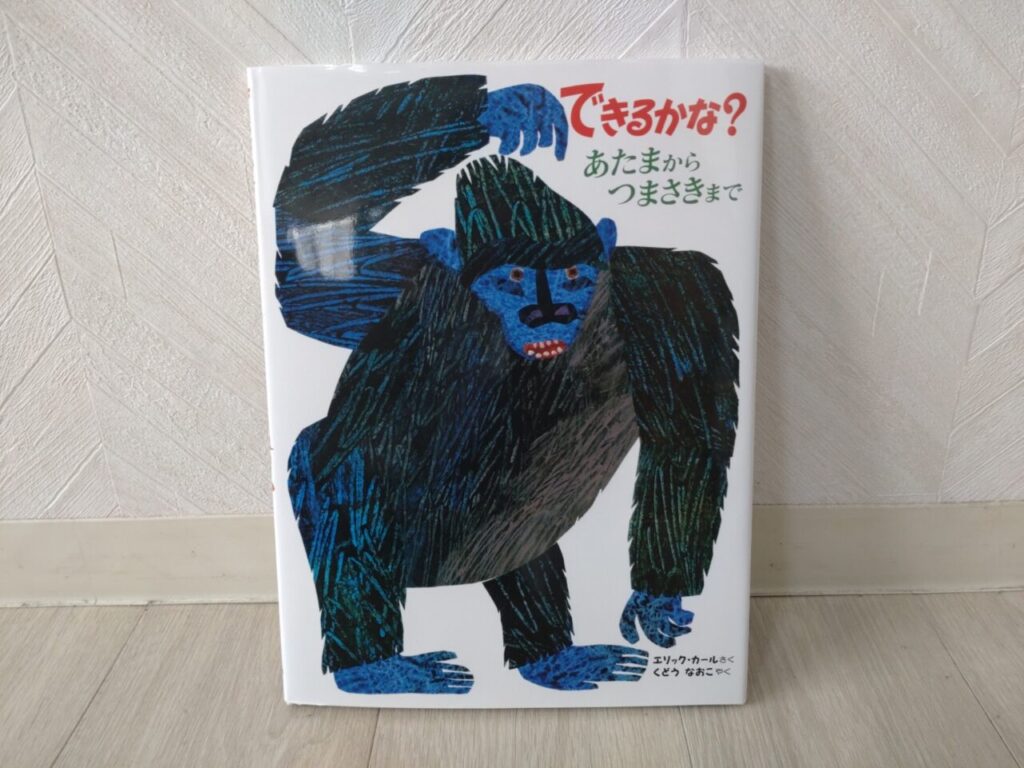 ペンギン、キリン、さる、ゴリラ。絵本の中の動物たちの動きに合わせて、一緒に体を動かしてみよう!楽しいまねっこ遊びの絵本。
